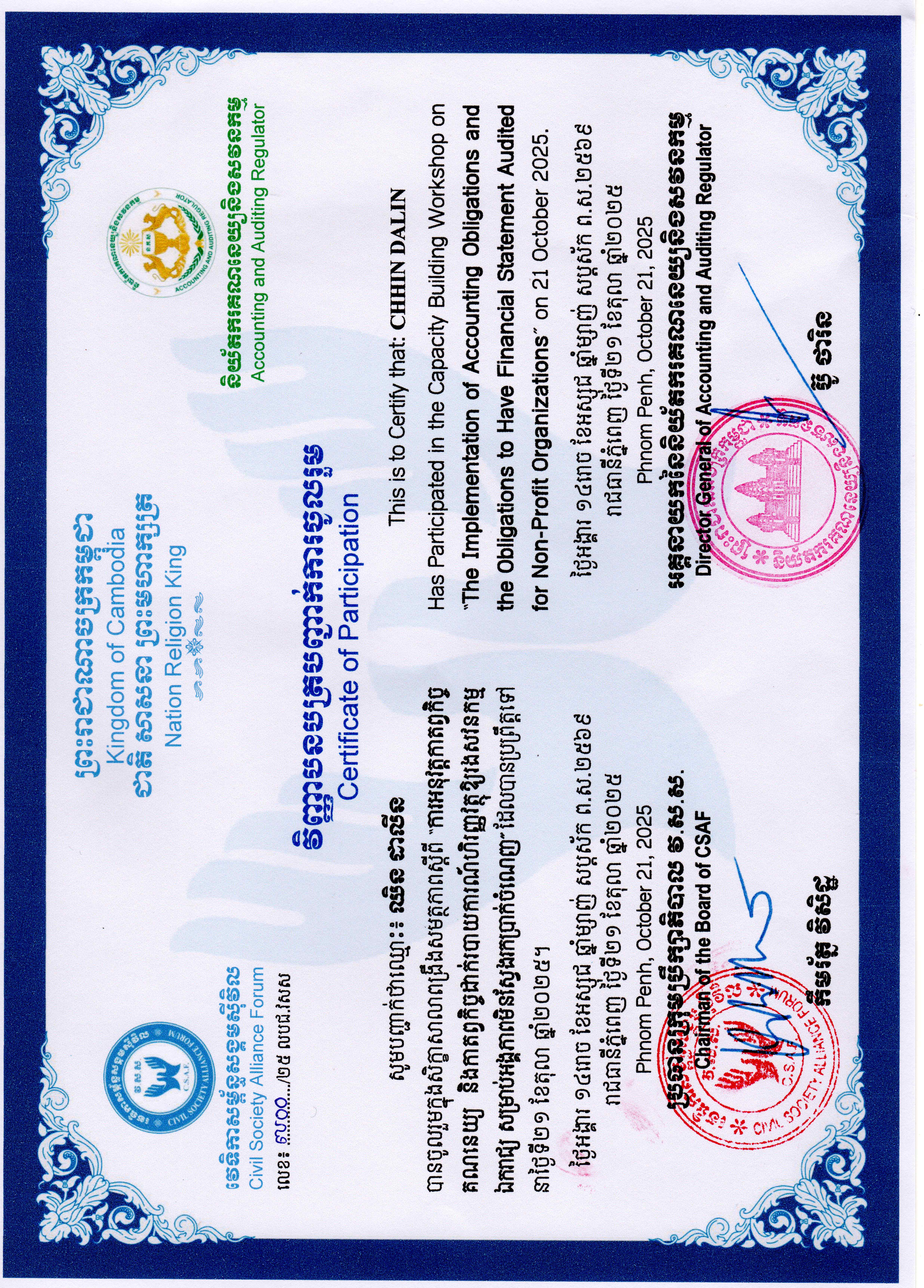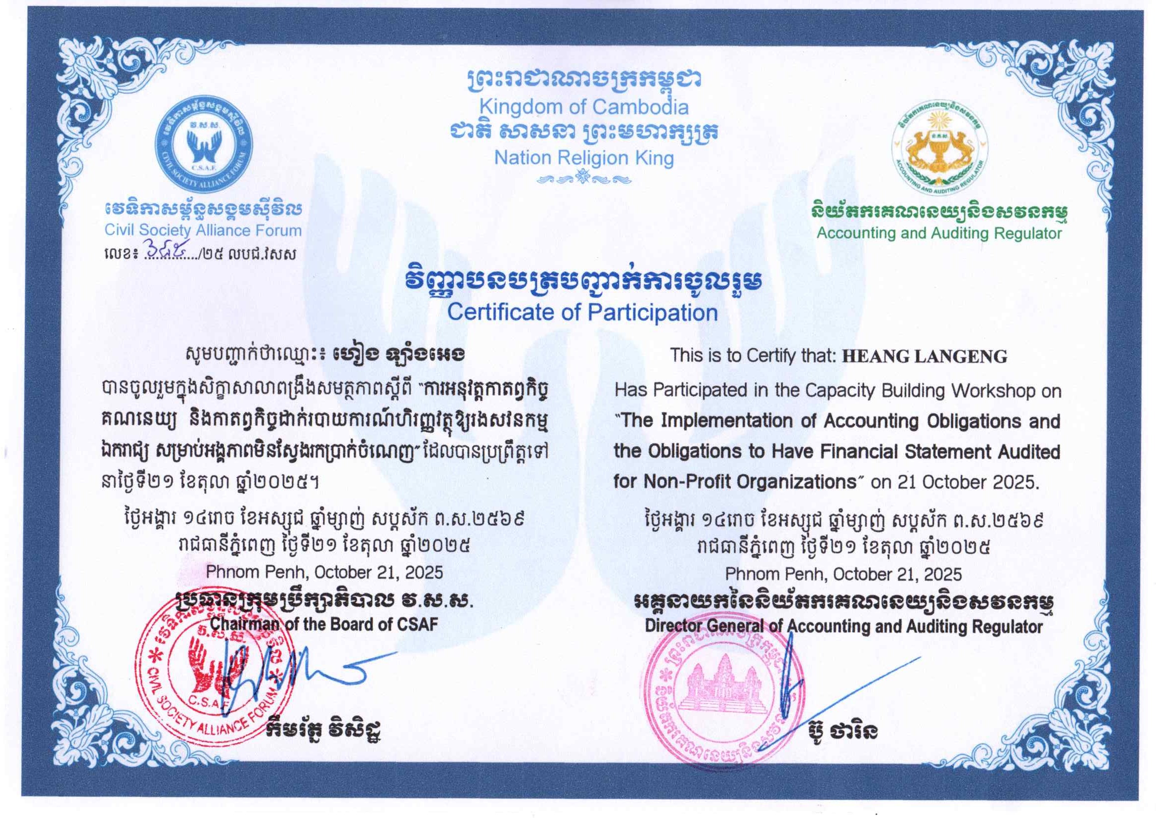 On 21 October 2025, CCAFO’s Chief of Finance and Administration, Mrs. Heang Langeng, and Deputy Head of Department, Mrs. Chhin Dalin, participated in a one-day workshop on Implementing Accounting and Auditing Services for Non-Governmental Organizations. The event was co-organized by the Department of Taxation and the Civil Society Forum and held at the Royal Academy of Sciences of Cambodia in Phnom Penh.